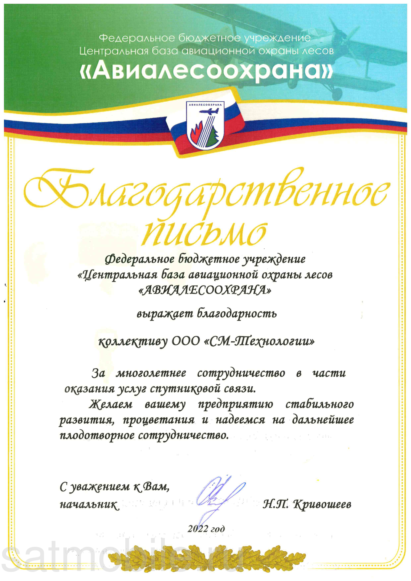 ФБУ «АВИАЛЕСОХРАНА» выражаем выражает благодарность коллективу ООО «СМ-Технологии» за многолетнее сотрудничество в части оказания услуг подвижной спутниковой связи.